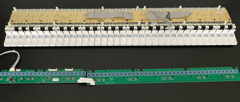 I’ve also bought a keybed which supports polyphonic aftertouch. You would not believe how hard it is to source a keybed like that unless you are an established company, manufacturers just do not want to sell to individuals or let me know anything about the internal mechanisms! After months of trying to source from a supplier, I gave up and bought a Korg Keystage 61. I didn’t want to get too attached to it so almost immediately I took it apart and scavenged it for the keybed and pressure sensors that implement the poly aftertouch. I still haven’t got round to figuring out how to wire it up to my synth, although the keybed has a suspicious wire coming from it labelled UART which I expect is simply MIDI out. As for the pressure sensors, that’s a whole new adventure…