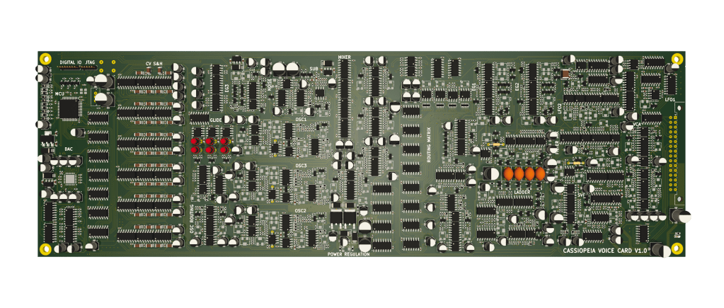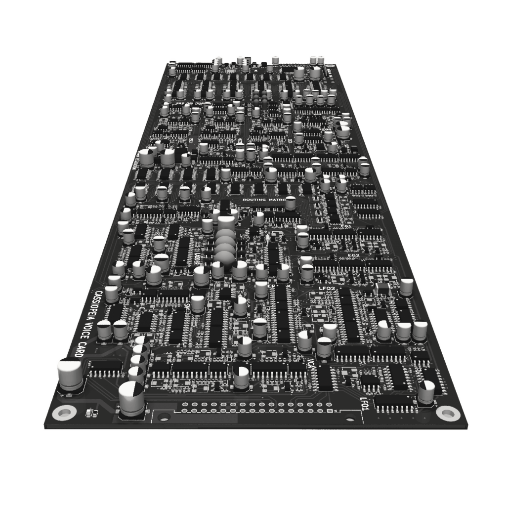 One of the hardest problems with a poly synth (other than tuning oh my god) is that every parameter must be voltage controlled. If you have an 8 voice synth you can’t really have a variable resistor in circuit to tweak a parameter such as the cutoff for a filter as you’d have to have an 8 gang potentiometer which don’t really exist or are prohibitively expensive and impractical. Instead a single voltage can be generated and sent to each control voltage (CV) input on each of the voice cards to somehow drive a change in the behaviour of the circuit. This is achieved in a multitude of ways in practice but rarely is it straightforward and it often adds a variety of additional parts.